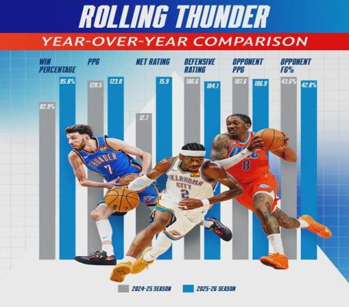当布克确定不打时,这场已经没什么悬念了。太阳14胜10负,排名西部第七。这个战绩超出大家的预期,上赛季太阳连附加赛都没进。雷霆豪取15连胜,目前23胜1负排名联盟第一。跟上赛季相比,本赛季雷霆多项数据更进一步: