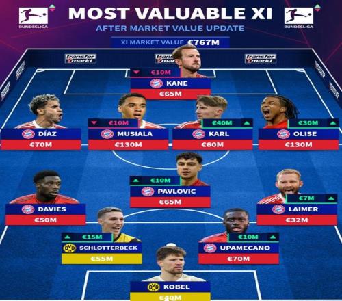 北京时间12月19日,在更新了德甲球员的身价之后,德转还列出了此次更新后身价德甲最贵的11人阵容,拜仁慕尼黑9人上榜,多特蒙德2人入围,穆西亚拉和此次更新身价暴涨3000万欧元的奥利塞同以1.3亿欧元的身价领衔,哈里-凯恩和路易斯-迪亚斯上榜。